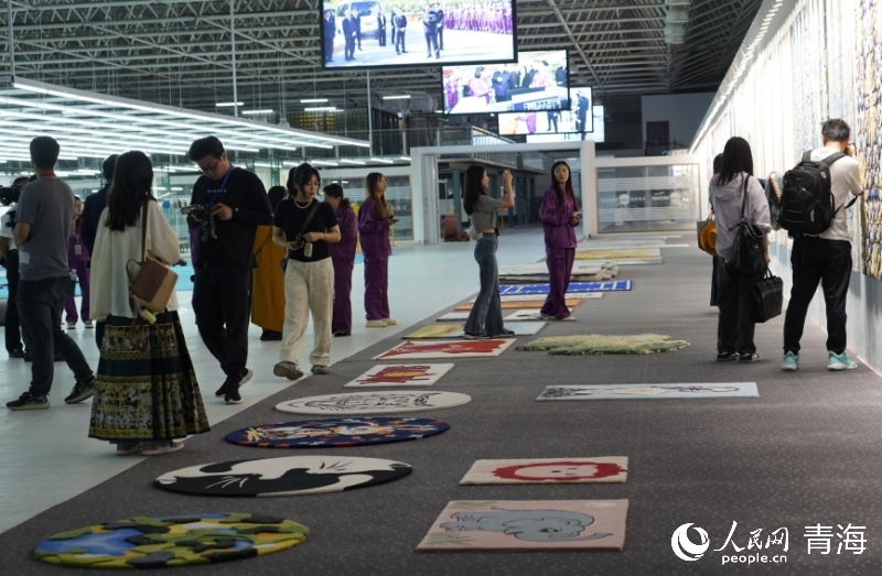 職工網(wǎng)絡(luò)達(dá)人與藏毯拍照打卡。人民網(wǎng) 馬可欣攝