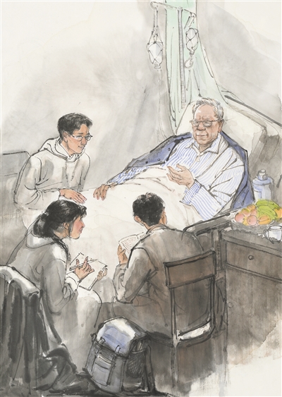 人民教師勤學(xué)篤行、求是創(chuàng)新的躬耕態(tài)度,給無數(shù)人以榜樣的力量,也給美術(shù)創(chuàng)作以靈感?!叭嗣窠逃摇眹?guó)家榮譽(yù)稱號(hào)獲得者衛(wèi)興華,終其一生都奮斗在勤學(xué)求真的道路上。90余歲時(shí),即使病痛纏身,他仍堅(jiān)持每天學(xué)習(xí)、工作。有感于衛(wèi)興華教授的敬業(yè)精神,高毅特意描繪了臥病在床的衛(wèi)興華堅(jiān)持與學(xué)生探討學(xué)術(shù)課題的場(chǎng)景,主人公那專注的神情令人動(dòng)容。像衛(wèi)興華這樣堅(jiān)守耕耘的教師還有許多。劉昌明水彩畫《一個(gè)教師的工作臺(tái)》便以細(xì)致的場(chǎng)景描繪表達(dá)出對(duì)教師群體的敬意。貼著泛黃舊紙的墻面、藥瓶和墨水瓶之間的教案、脫漆的木桌、一副老花眼鏡……畫家在此調(diào)動(dòng)了一切能夠反映老一輩教育者辛勤伏案的元素,象征著沒有直接出場(chǎng)的教師形象?!按颂師o聲勝有聲”的表達(dá)效果,令人回味無窮。