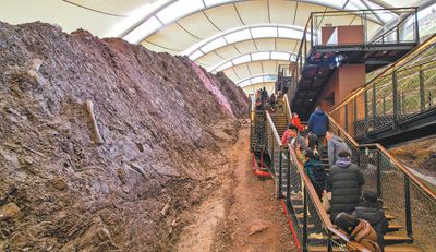 游客在重慶云陽世界地質(zhì)公園參觀恐龍化石墻。新華社發(fā)