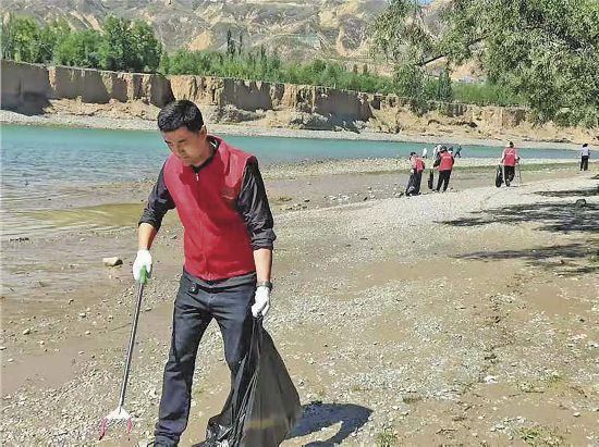 志愿者在黃河邊撿拾垃圾。海東市生態(tài)環(huán)境局供圖