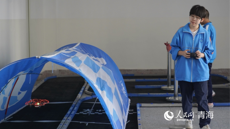 在西寧市第十中學(xué)機(jī)器人教室內(nèi),各類機(jī)器人、航模、無人機(jī)等應(yīng)有盡有,學(xué)生們利用專業(yè)賽道進(jìn)行無人機(jī)飛行操作。
