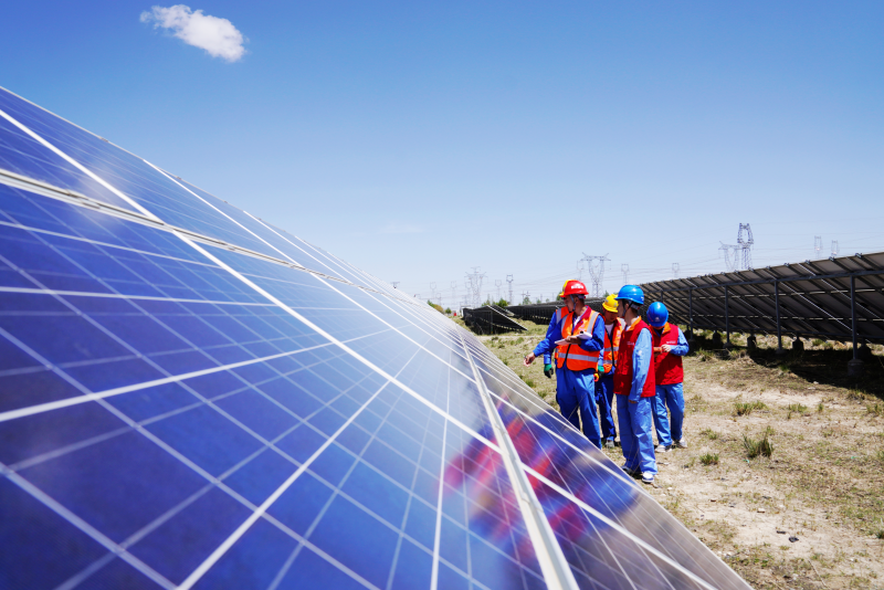 國網(wǎng)青海省電力公司工作人員在海南藏族自治州共和縣千萬千瓦級可再生能源基地光伏發(fā)電產(chǎn)業(yè)園區(qū)內(nèi)了解企業(yè)發(fā)電情況,助力企業(yè)高效發(fā)電、穩(wěn)定增收。徐琛攝