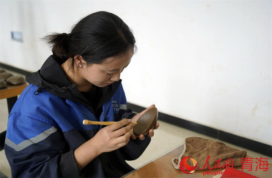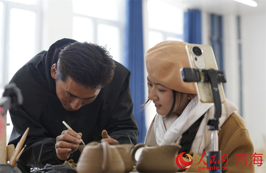 青海班瑪黑陶技藝走進(jìn)直播間。人民網(wǎng) 顧斐菲攝
