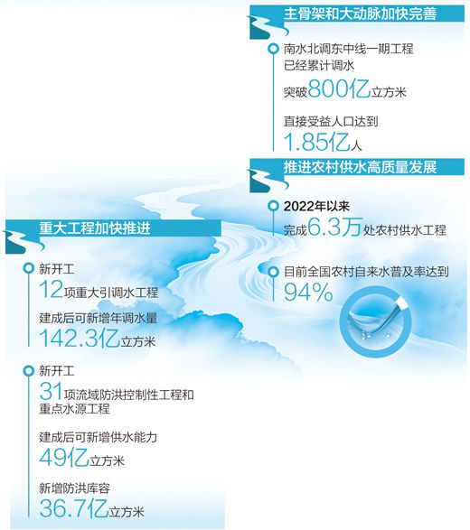 其次是一批國(guó)家水網(wǎng)重大工程加快推進(jìn)。一方面是骨干輸排水通道,2022年以來(lái),珠三角水資源配置、引江濟(jì)淮一期、引漢濟(jì)渭等12項(xiàng)重大引調(diào)水工程建成通水,新增年調(diào)水量124.8億立方米;新開(kāi)工環(huán)北部灣水資源配置、吉林水網(wǎng)骨干工程等12項(xiàng)重大引調(diào)水工程,這些工程建成后,可新增年調(diào)水量142.3億立方米。另一方面是重大調(diào)蓄結(jié)點(diǎn),西江大藤峽、新疆大石門(mén)等24座大型水庫(kù)建成投用,新增供水能力34.6億立方米,新增防洪庫(kù)容26.6億立方米。