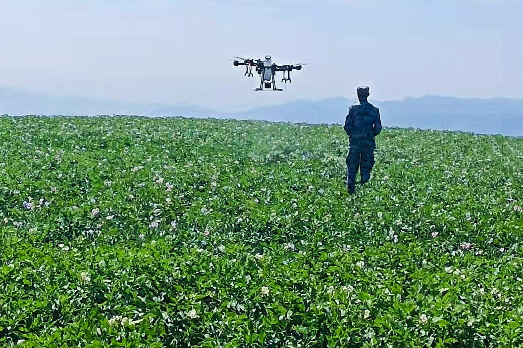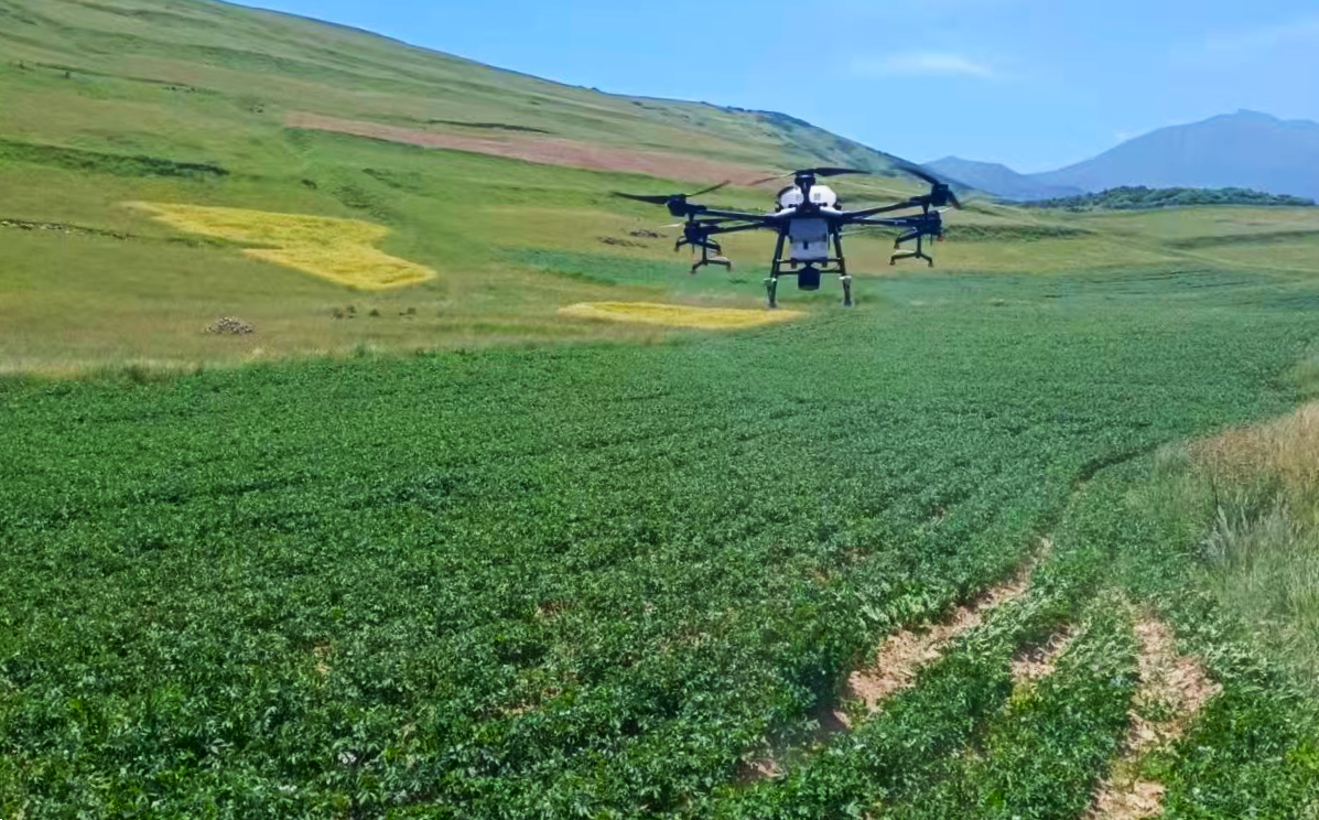 種植戶通過(guò)無(wú)人機(jī)巡視馬鈴薯田。樂(lè)都區(qū)委宣傳部供圖