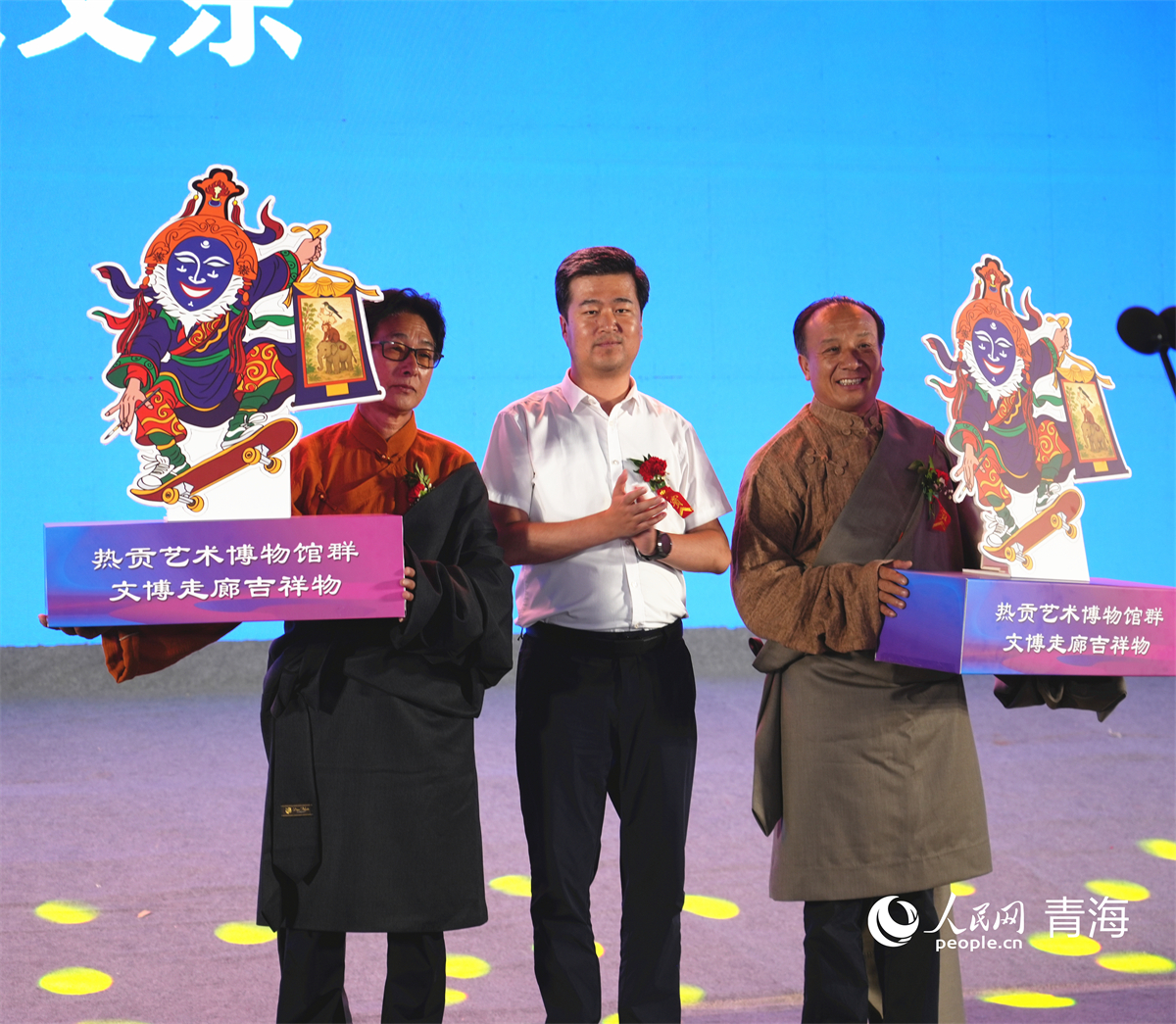 向中國(guó)工藝美術(shù)大師娘本(右一)、夏吾角(左一)贈(zèng)送文博走廊吉祥物。人民網(wǎng)記者 楊啟紅攝