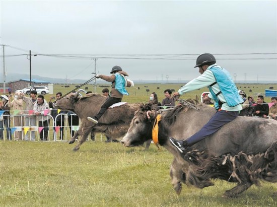 賽牦牛項目現(xiàn)場,“高原之舟”威風(fēng)凜凜向前沖刺。青海日報記者 劉程錦 攝
