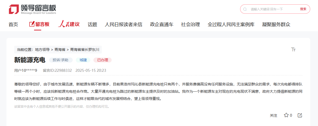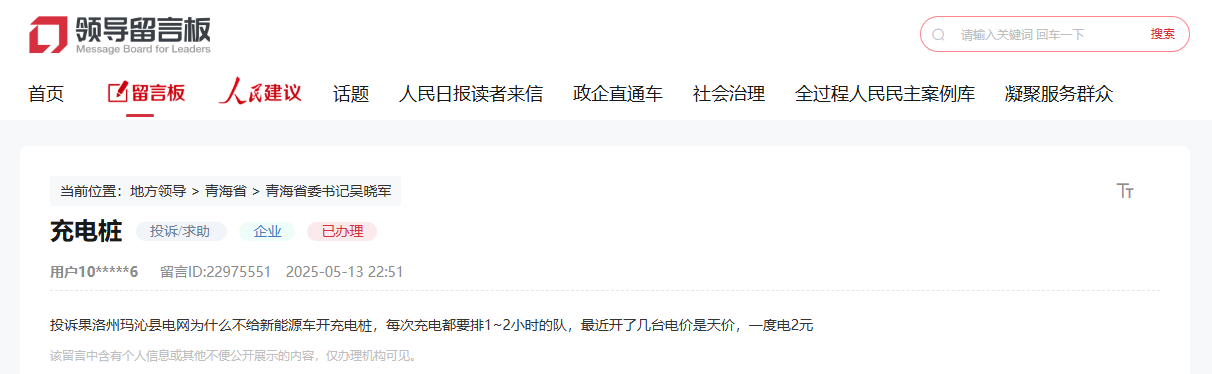 2025年5月,有群眾在人民網(wǎng)“領(lǐng)導(dǎo)留言板”留言表示,自己是青海省果洛藏族自治州瑪沁縣的出租車司機(jī),當(dāng)?shù)匾呀?jīng)安裝了一些新能源充電樁,但都不能使用,能使用的充電樁也都屈指可數(shù),每次充電都要排1至2小時(shí)的隊(duì),而且一度電2元。