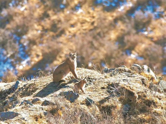 猞猁一家三口——“那是2021年11月,我正在麥尼溝放牧。剛爬上山坡,就注意到對面山頭上有一個身影,仔細(xì)一看,竟是只猞猁。我立刻停下腳步,迅速給相機裝上長焦鏡頭,透過鏡頭仔細(xì)觀察。原來那是一只猞猁媽媽,身邊還緊跟著幼崽,它們安靜地趴在山頂。我屏住呼吸,連續(xù)拍攝了幾張?!?/p>