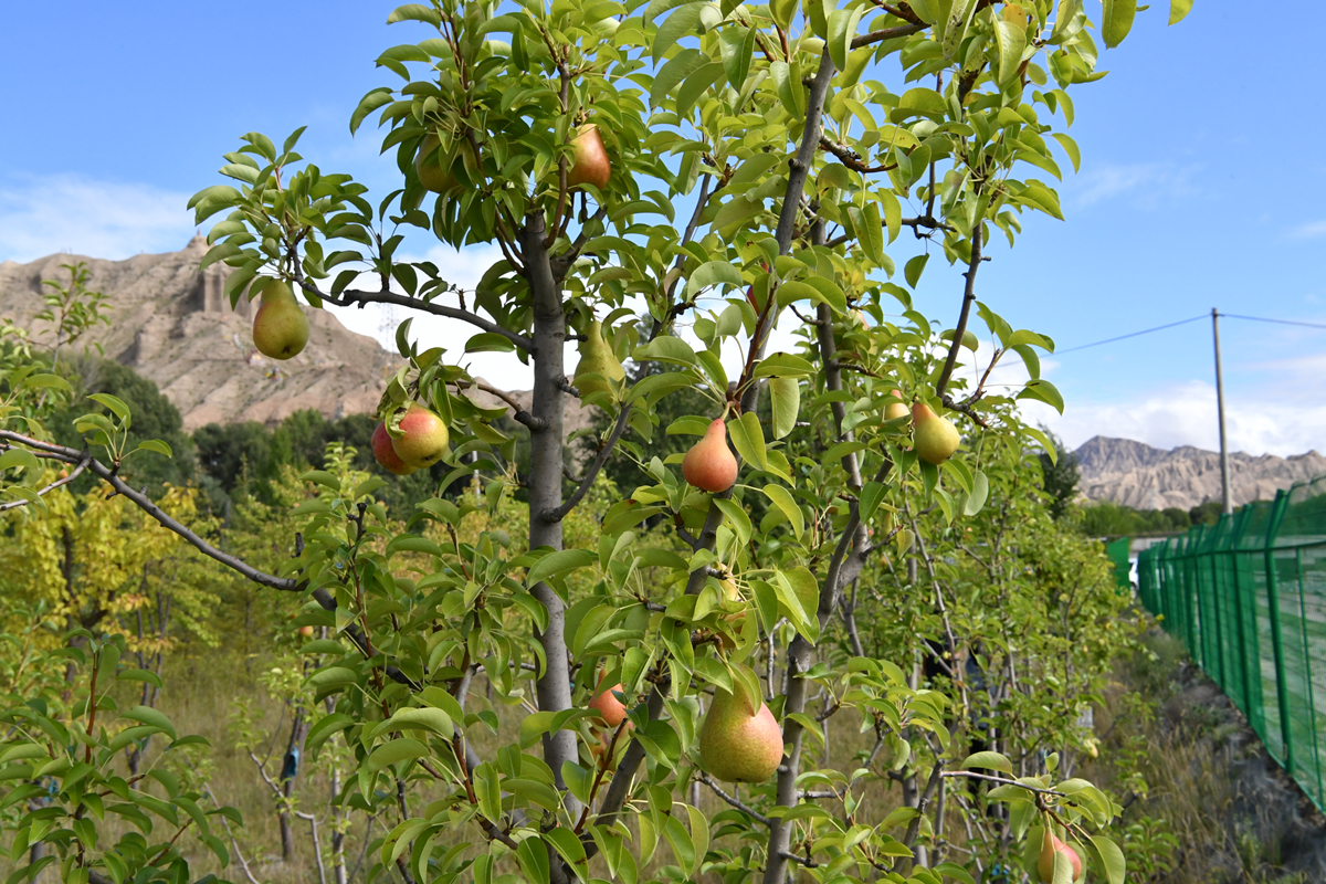 貴德縣河西鎮(zhèn)賀爾加村村民在生態(tài)林果樹下收獲梨子。劉紅攝