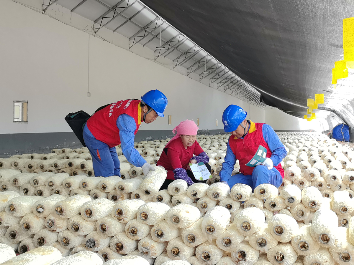 國網(wǎng)海東供電公司民和縣供電公司黨員服務(wù)隊員正在了解食用菌長勢。趙梅芳 攝