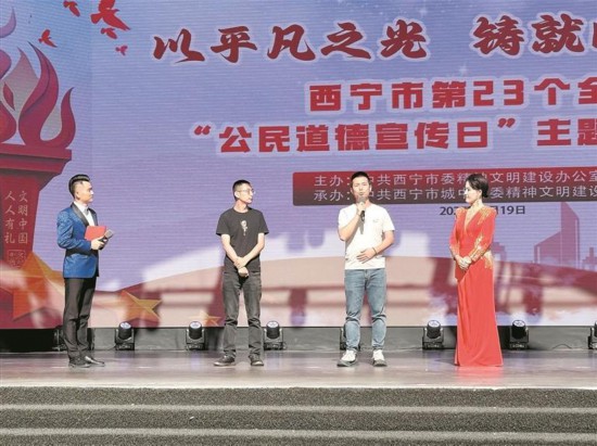 西寧“公民道德宣傳日”主題示范活動(dòng)中,市民分享身邊好人好事,讓文明新風(fēng)浸潤(rùn)人心。青海日?qǐng)?bào)記者 陶 然 實(shí)習(xí)生 宋清溪 攝