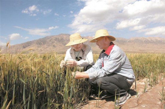 孔祥國(guó)與陳大錄查看青稞長(zhǎng)勢(shì)。青海日?qǐng)?bào)實(shí)習(xí)記者 朱煒明 攝