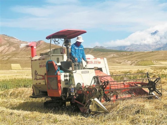 為確保打贏農業(yè)生產豐收戰(zhàn),今年海北州積極落實“藏糧于地、藏糧于技”戰(zhàn)略。全州落實農作物播種面積57573.33公頃,穩(wěn)定建設青稞油菜良種核心繁育基地3333.33公頃,良繁基地49個,扶持種子生產企業(yè)20家以上,積極推廣糧油新品種新技術38666.67公頃,提振糧油種子“芯片”助力糧油增產增效;投入各類拖拉機及聯(lián)合收割機共18975臺,全程機械化北斗導航30臺套開展秋收,農作物機收率達98%以上。青海日報記者 王晶 攝
