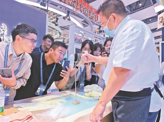 最熱鬧的當(dāng)數(shù)拉面技藝展示。全國(guó)勞動(dòng)模范、青海拉面匠人韓玉龍的案板前已圍得水泄不通。只見(jiàn)他抓起面團(tuán),在手中飛速揉搓、拉抻,面條從粗變細(xì),最后竟細(xì)如發(fā)絲。當(dāng)他拿起一根針,將十余根面條順利穿入針孔時(shí),人群中瞬間爆發(fā)出雷鳴般的掌聲?!疤衿媪?!”一位學(xué)生舉著手機(jī)錄完視頻,興奮地說(shuō),“一定要去青海吃正宗的牛肉拉面!”韓玉龍擦了擦手,遞上這次帶來(lái)的牛肉面產(chǎn)品,笑著說(shuō):“現(xiàn)在我們已經(jīng)研發(fā)了新產(chǎn)品,如果大家想品嘗現(xiàn)做的手藝,可以到線下店里——畢竟我們青海的拉面已經(jīng)開(kāi)遍全國(guó),還走進(jìn)了二十多個(gè)國(guó)家。”
