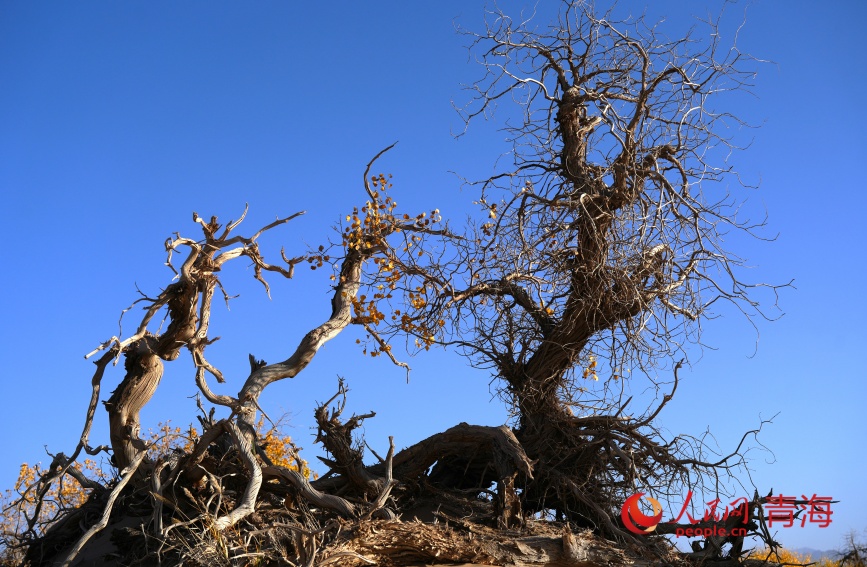 托勒海在蒙古語中即是胡楊很多的地方,這里是青海唯一、世界上海拔最高的胡楊林。這里的胡楊樹形態(tài)各異,有的枝葉茂盛,葉子在這個季節(jié)完全變成了金黃色;有的枯樹依然挺拔地站立著,灰白的枝干在藍天下顯得十分清晰。