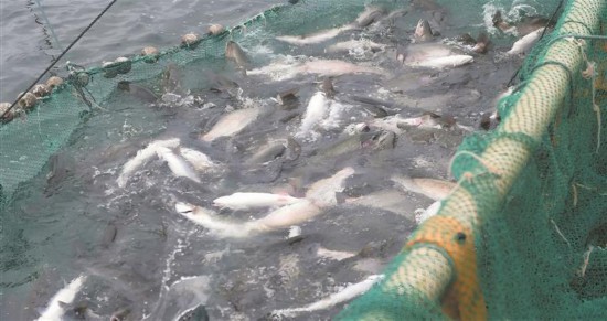 網(wǎng)箱內(nèi)的三文魚。