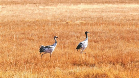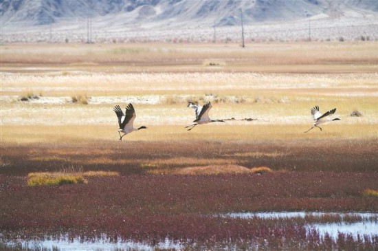 金秋時節(jié),在海西蒙古族藏族自治州大柴旦草原上,國家一級保護動物黑頸鶴或昂首挺立,警覺地瞭望遠方;或低頭在水洼淺灘間覓食,姿態(tài)優(yōu)雅從容。它們黑白分明的羽毛在秋日陽光的照耀下格外醒目,與周圍泛黃的草甸、湛藍的天空和連綿的遠山交相輝映,構(gòu)成一幅動靜相宜、和諧共生的自然圖景。(2025年10月9日攝于海西州大柴旦)