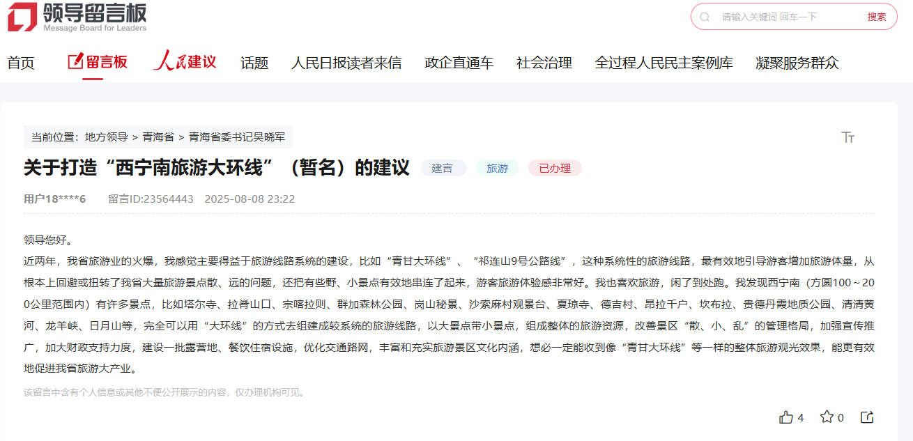 近日,有群眾在人民網(wǎng)“領(lǐng)導(dǎo)留言板”留言建議青海打造西寧南旅游大環(huán)線。該群眾建議,西寧南(方圓100至200公里范圍內(nèi))有許多景點(diǎn),比如塔爾寺、拉脊山口、宗喀拉則、群加國(guó)家森林公園、崗山秘景、沙索麻村觀景臺(tái)、夏瓊寺、德吉村、昂拉千戶、坎布拉世界地質(zhì)公園、貴德地質(zhì)公園、清清黃河、龍羊峽、日月山等,完全可以用“大環(huán)線”的方式去組建成較系統(tǒng)的旅游線路,以大景點(diǎn)帶小景點(diǎn),組成整體的旅游資源,優(yōu)化景區(qū)“散、小、亂”的格局,加強(qiáng)宣傳推廣,加大財(cái)政支持力度,建設(shè)一批露營(yíng)地、餐飲住宿設(shè)施,優(yōu)化交通路網(wǎng),豐富和充實(shí)旅游景區(qū)文化內(nèi)涵,定能收到像“青甘大環(huán)線”等一樣的整體旅游觀光效果,能更有效地促進(jìn)青海旅游產(chǎn)業(yè)發(fā)展。
