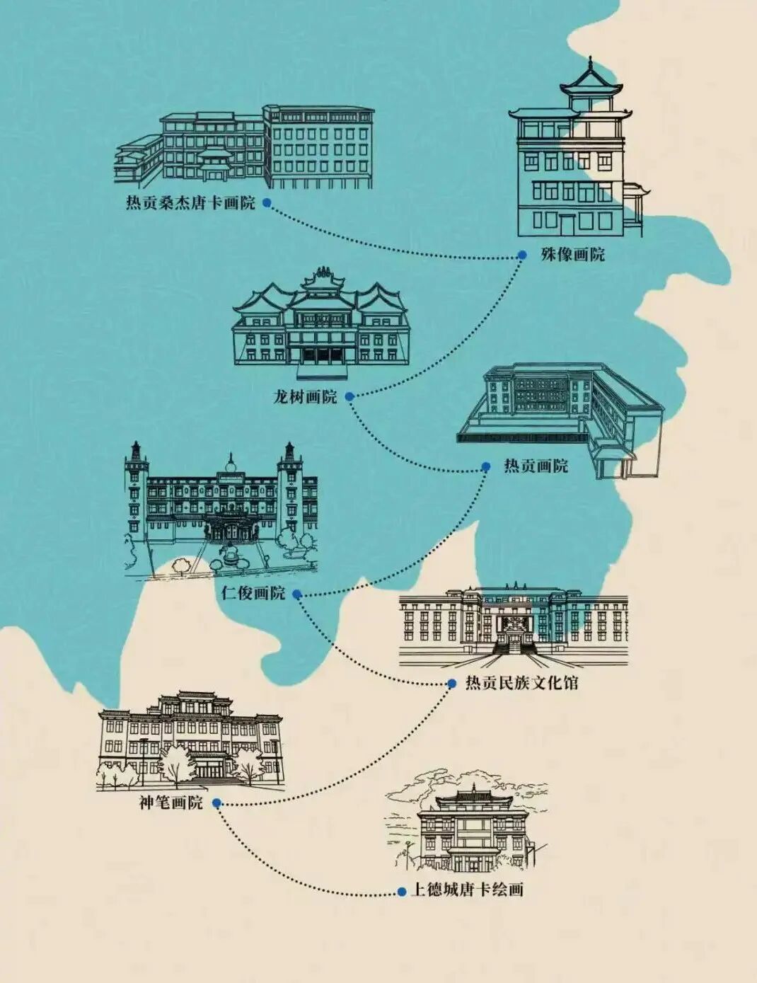 熱貢藝術(shù)博物館群文博走廊旨在秉持“以文塑旅、以旅帶商、以商促收”高質(zhì)量發(fā)展理念,著力推動(dòng)國際生態(tài)旅游目的地青南試驗(yàn)區(qū)熱貢文化生態(tài)高地建設(shè),走廊有效串起熱貢藝術(shù)民間博物館(仁俊院)、國家級(jí)文化產(chǎn)業(yè)示范基地、國家級(jí)非物質(zhì)文化遺產(chǎn)生產(chǎn)性保護(hù)示范基地(熱貢畫院)、國家AAA景區(qū)+綜合畫院(龍樹畫院)等規(guī)模性、標(biāo)準(zhǔn)性畫院17家,構(gòu)建設(shè)計(jì)“探源文脈·文博走廊”特色線路,同步完善“一院一格”文博走廊表示系統(tǒng),置設(shè)熱貢藝術(shù)博物館群文博走廊大型總導(dǎo)覽2處,設(shè)計(jì)完成文博走廊核心區(qū)動(dòng)態(tài)、靜態(tài)游覽地圖,實(shí)現(xiàn)線下導(dǎo)航、云上觀展、預(yù)約訂單等多重功能。